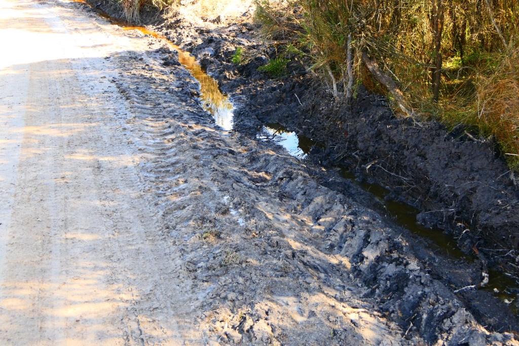 As it is now, where one of the trucks slid off – fortunately not bogged