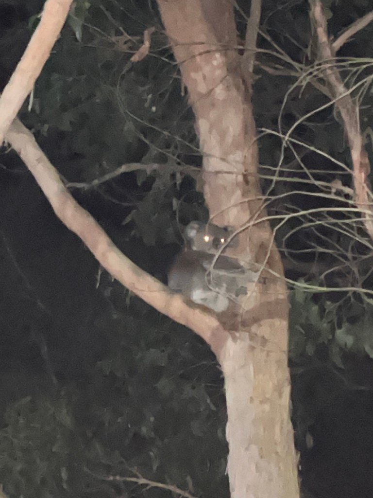 We camped out at the block the night before the septic guys came (since we had an early start), and were startled by something crashing through the bush, making a helluva racket. By the time I got my phone, he’d climbed part way up a tree and was bellowing. Looks a little demonic.