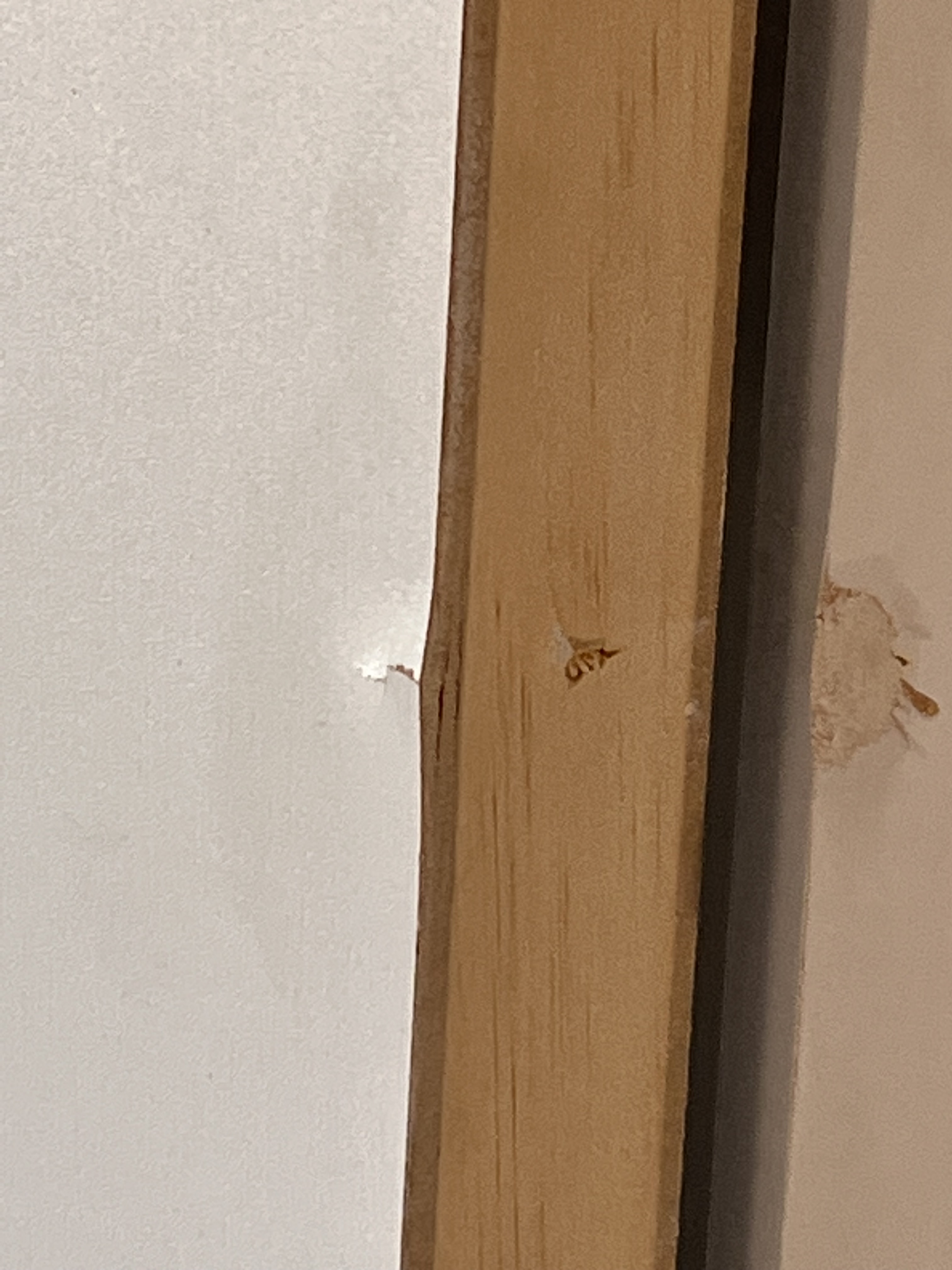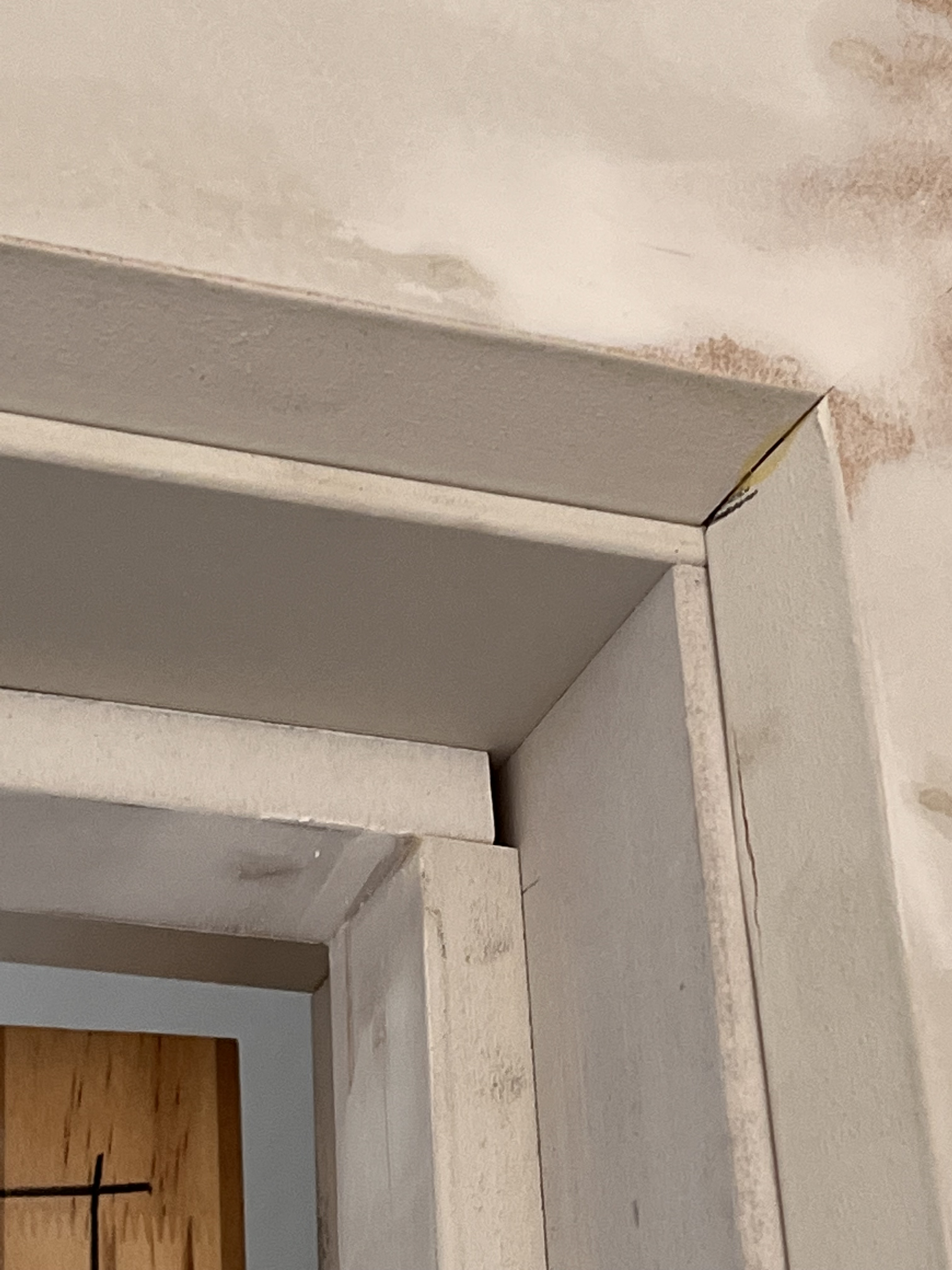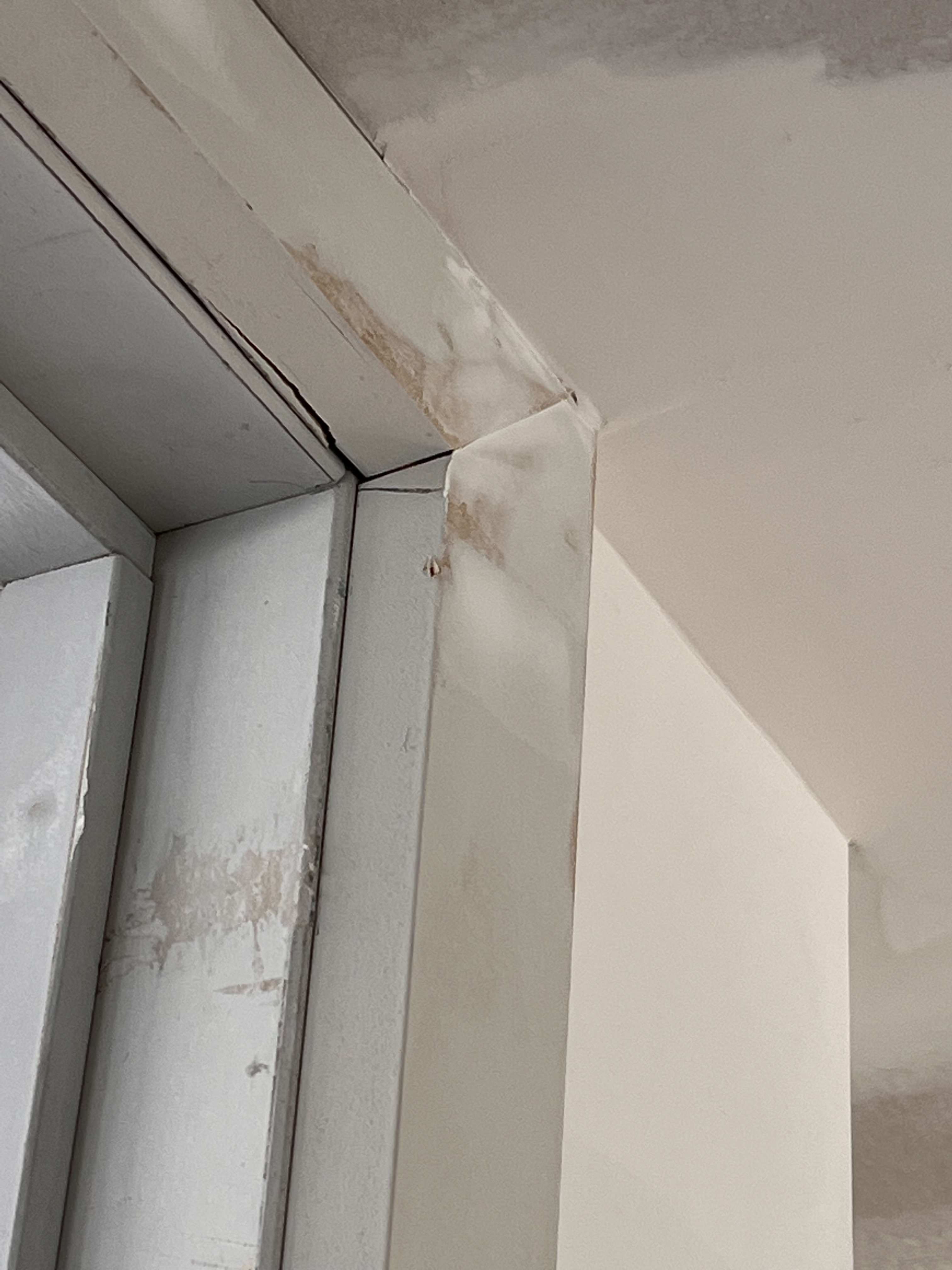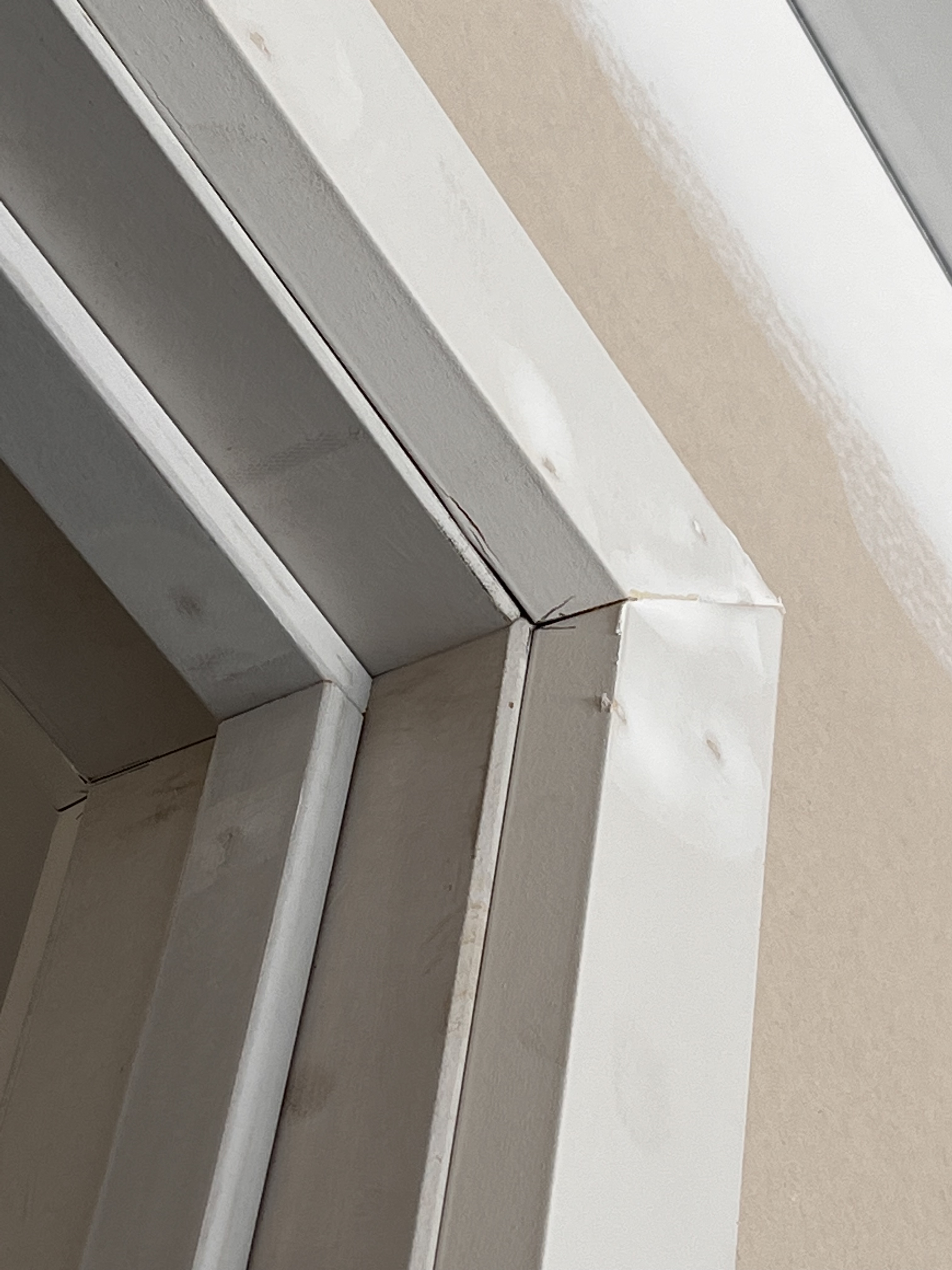 The architraves went in, but with multiple holes put in the plaster, and not fitted or cut well, some protruding from the walls, and split.