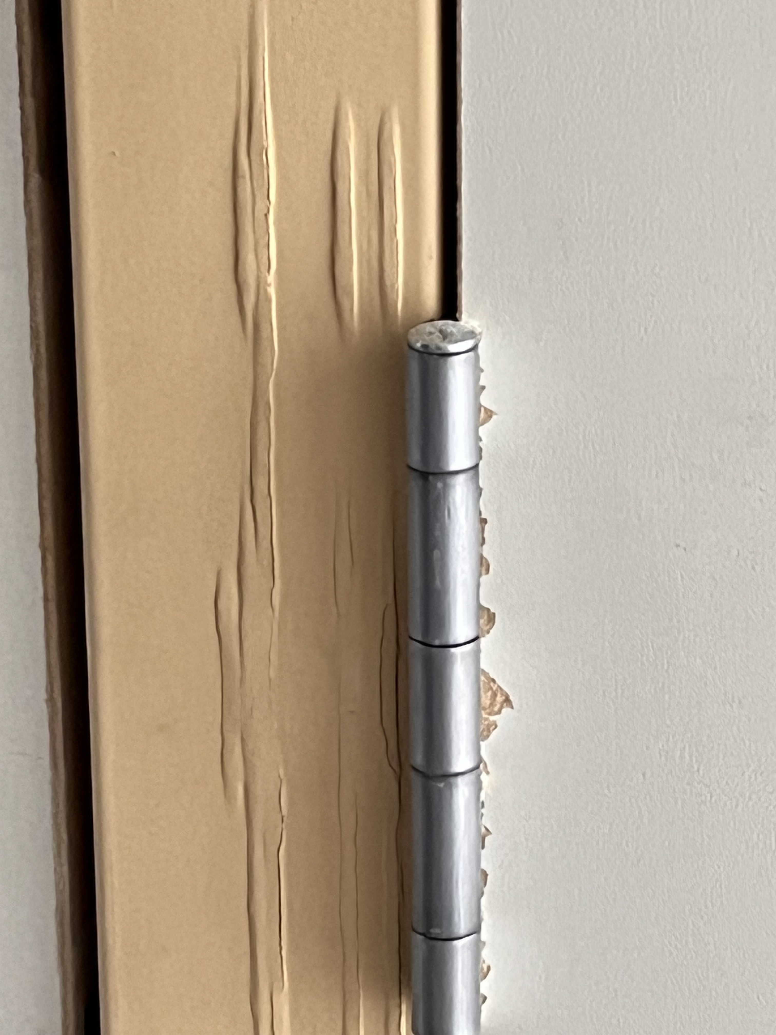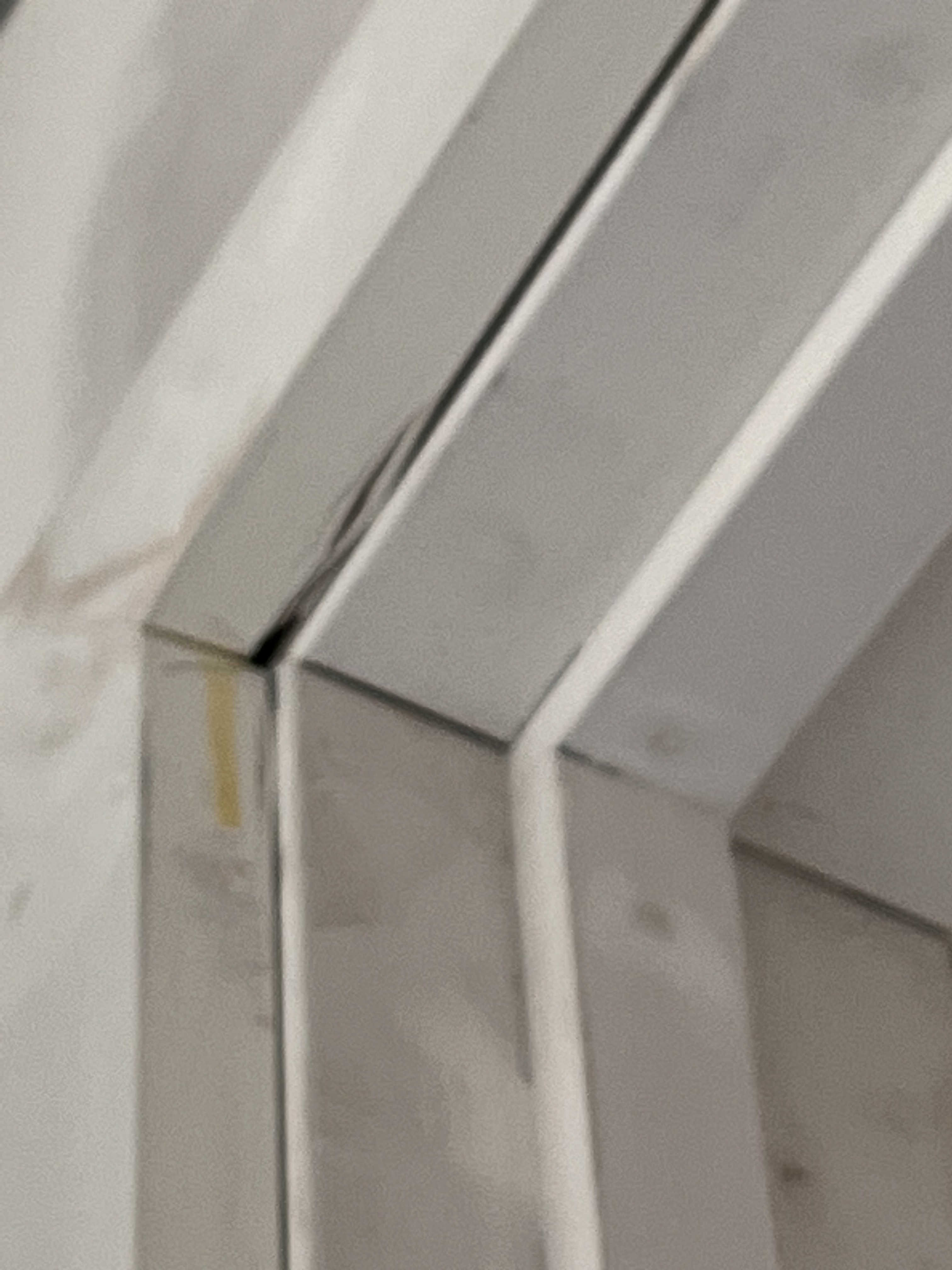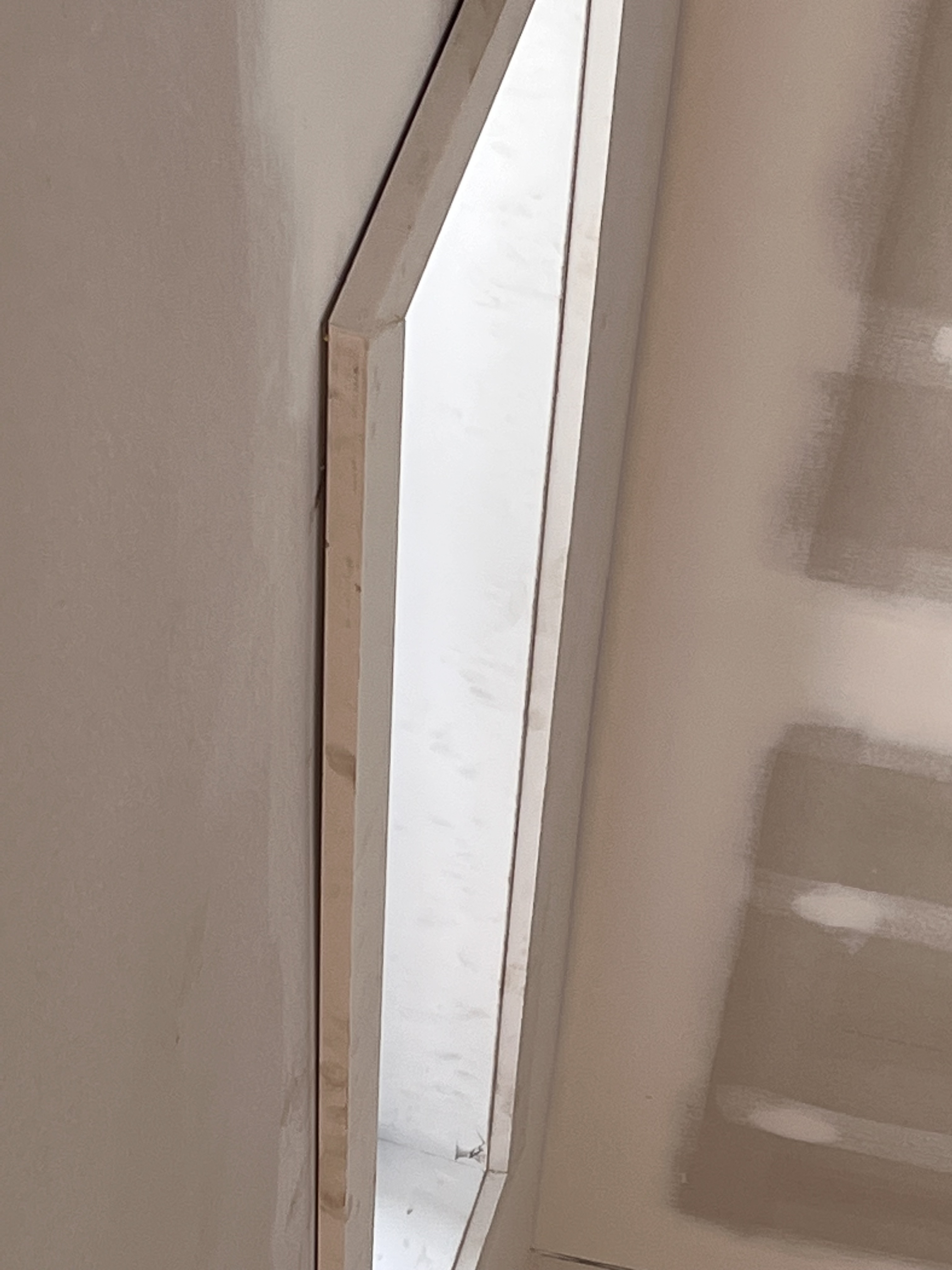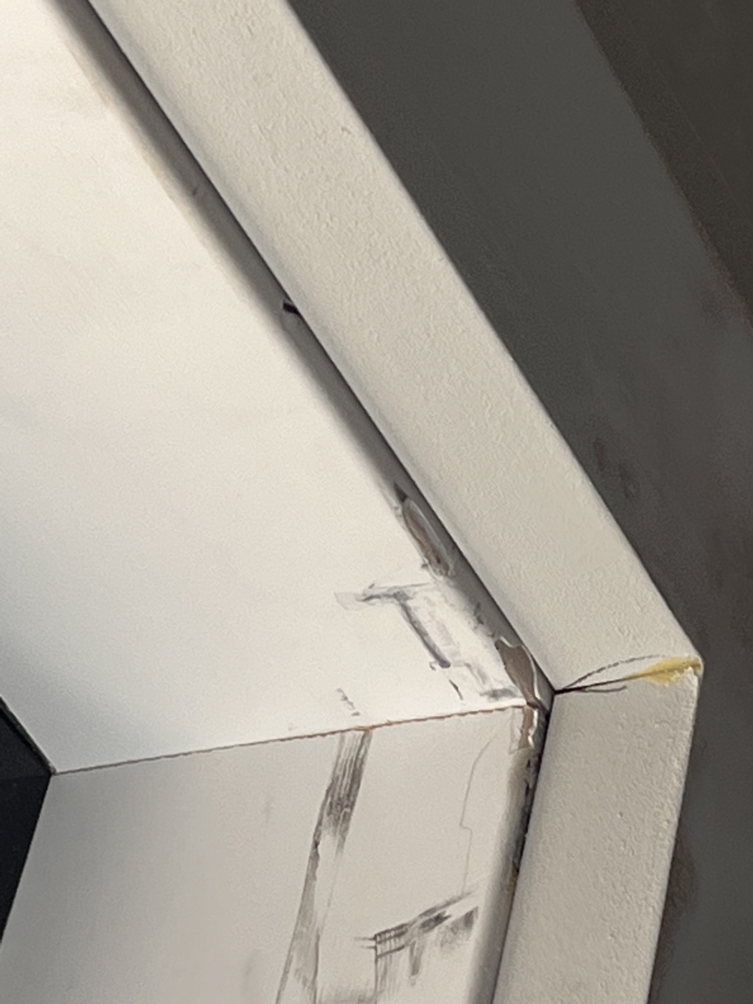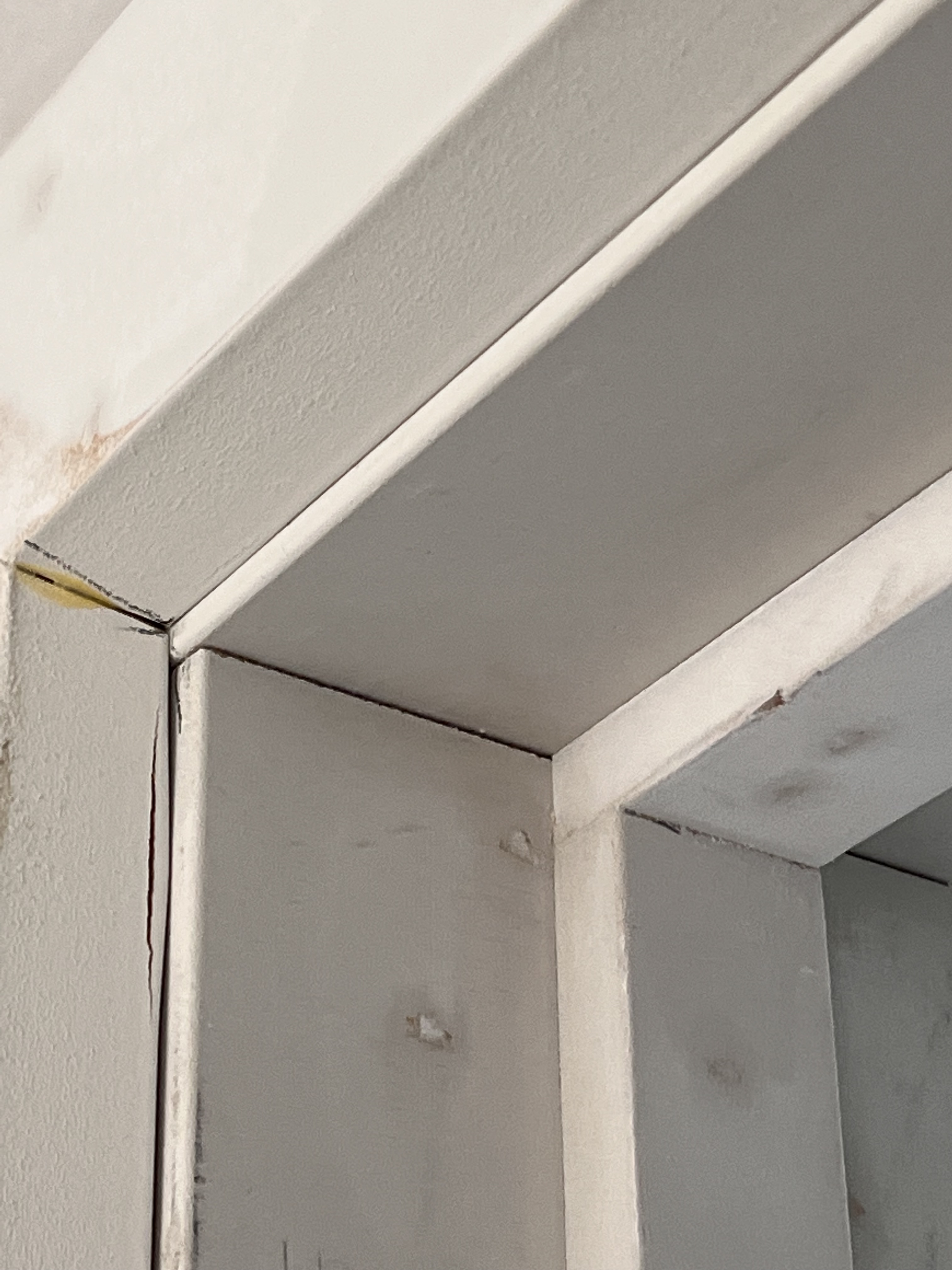 The architraves went in, but with multiple holes put in the plaster, and not fitted or cut well, some protruding from the walls, and split.