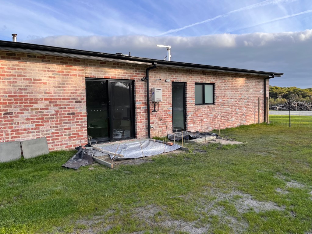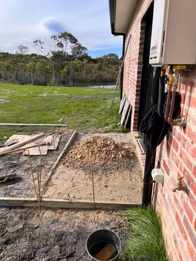 We built the path to the bushfire shelter (1.2m wide, non-combustible for fire regs) – edged with left over bricks and filled with tynong toppings. We ended up doing a wide brick edged path from the wood shed around the side of the house so its easy to move wood and access to all of the utilities is from hardstand.