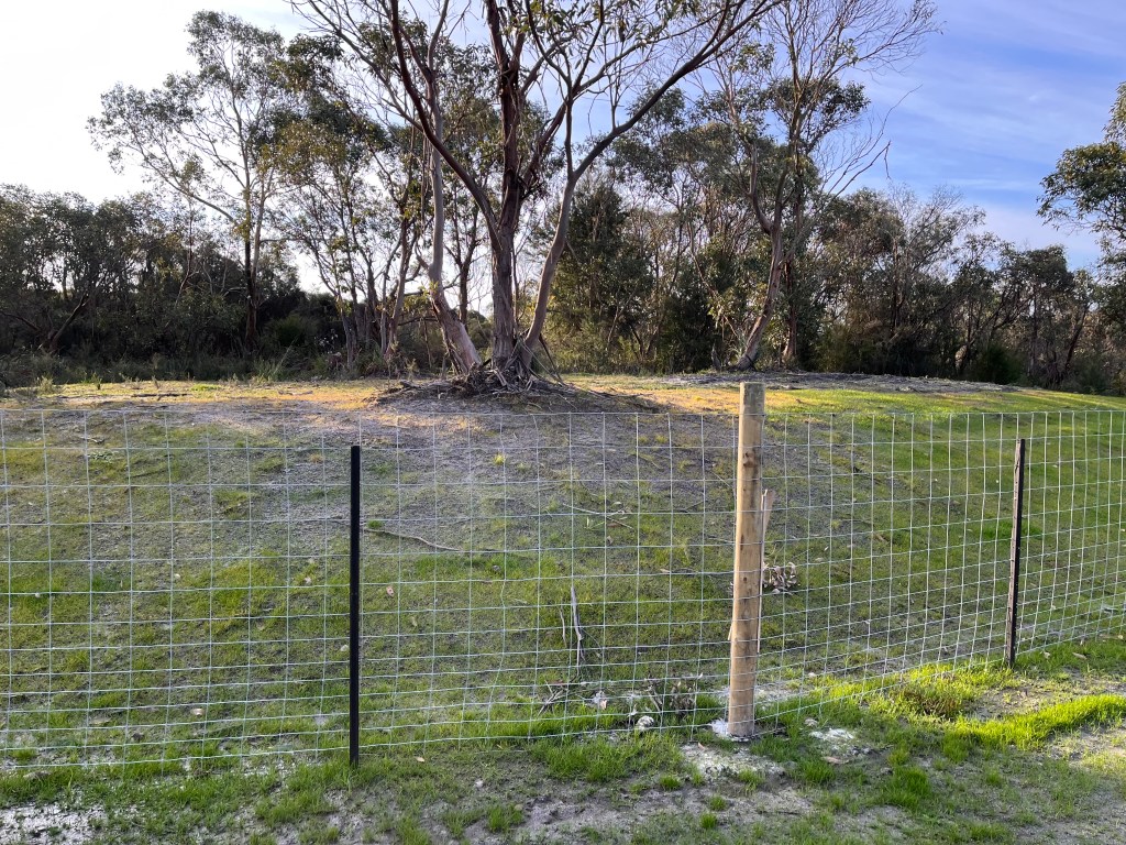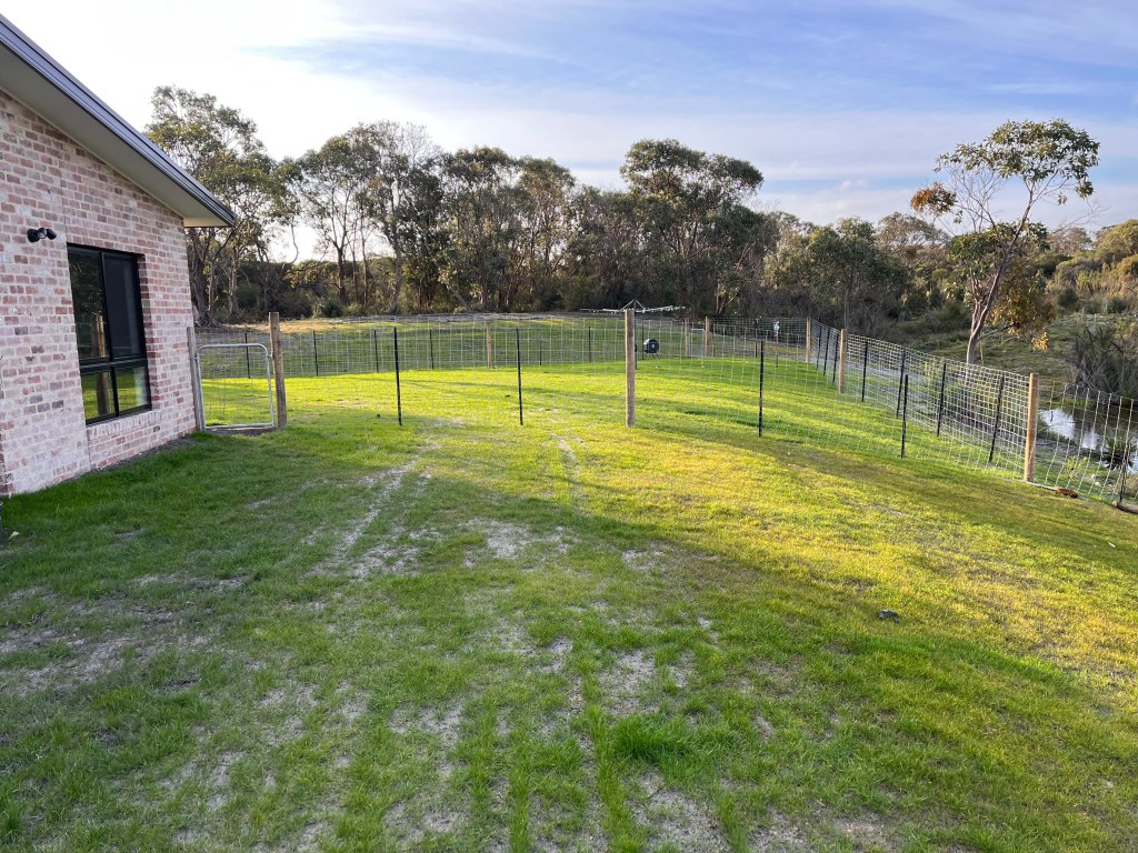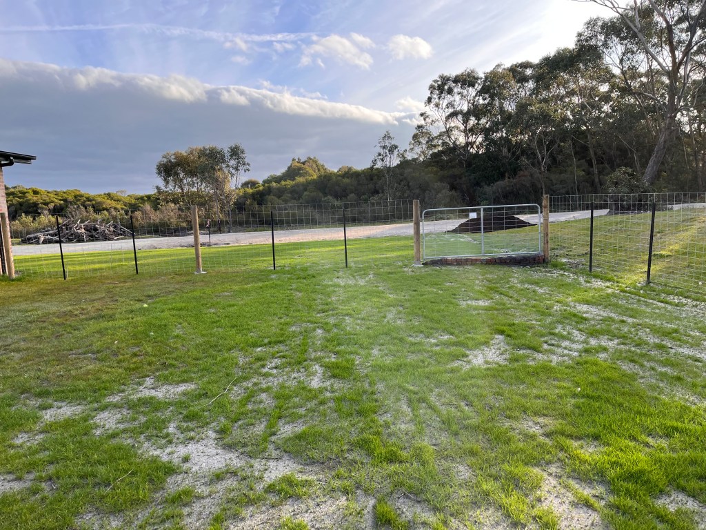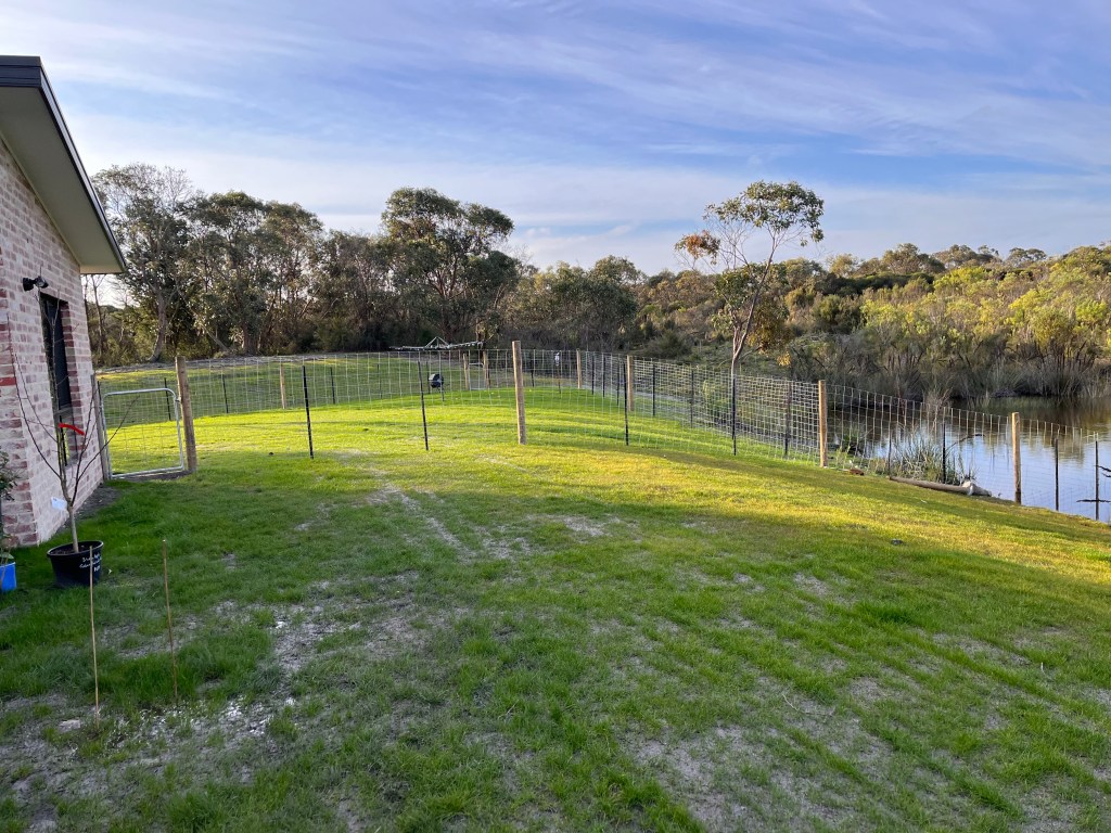 We’ve built a fenced yard for the dog enclosure – 1.5m tall dog mesh and run some fencing down to the dam to (mostly) contain them if we’re out the back. We still have to add the snake mesh before the weather warms up.