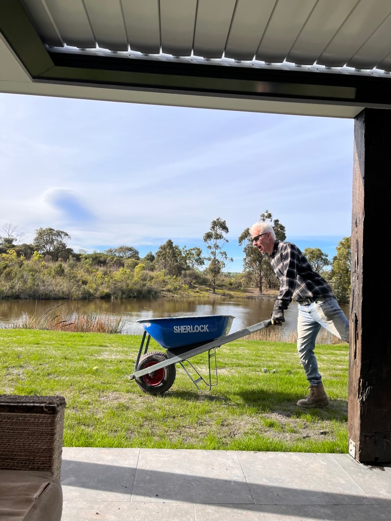 We’ve had to get and spread a lot of soil, because the earthworks guys didn’t leave enough – what we had covered up the waffle pod slab, but left a low patch all around the house -creating a lovely moat when it rains. Perfect for creating wet muddy dog prints through the house. We’re gradually filling it in. I definitely don’t like mopping.