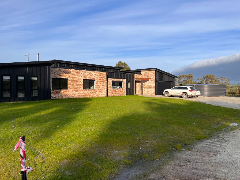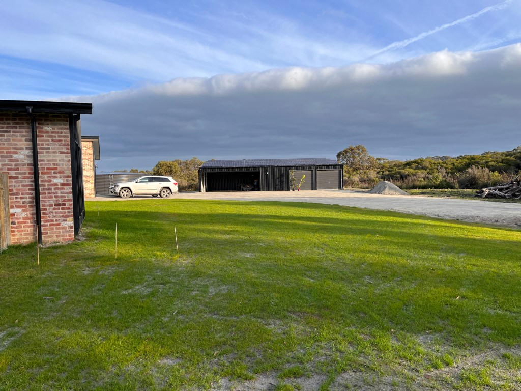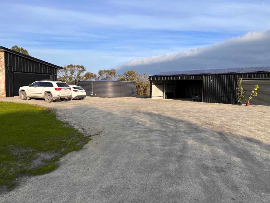 We bought tynong toppings to do the hard stand out the front, but despite being ordered it didn’t turn up when the bobcat was here moving the soil up to the house. So manually spreading it has been hard work – we still have a few minor puddles, but it’s doing great. The driveway is muddy and potholed but that needs to wait until it stops raining since the cheaper local gravel turns into quicksand the first time it gets wet. The first time it dries, it sets, but it won’t get to dry until summer… So can’t be laid until then.