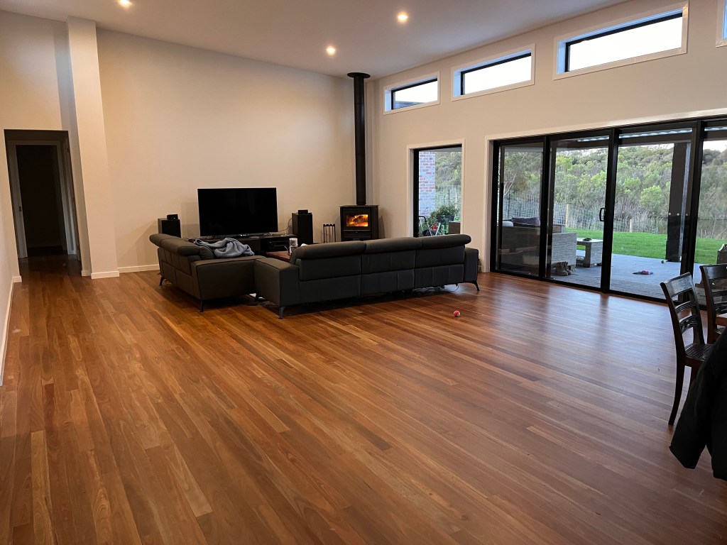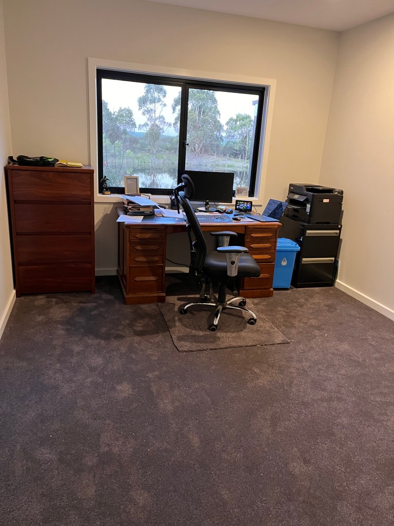 On the Saturday before we were due to move in the builder touched up the scratches on the floor, but didn’t mix the floor coating correctly, so we ended up with shiny puddles on our beautiful mat finish floor. We saw it on the Sunday and had absolute kittens. He tried to fix on Monday, and it just looked like we had dirty splodges on it. By then, with the furniture removals booked for Wednesday, we had to move in anyway. A week later, we had to move out so that it could be professionally refinished. And move a bunch of the furniture Fortunately, my lovely sister was away on holiday and loaned us her house, while it was fixed. My study still has real problems, but we got sick of the furniture being scattered around the house so have moved it back in. Not sure when or even if it will be fixed, but we really wanted to get sorted and unpacked.