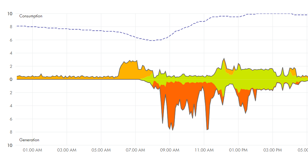 (Interesting improvement in production – in June at 9:20 we got 6.6kW, in August we got 7.5 kW, and we started making power almost half an hour earlier – nice!)