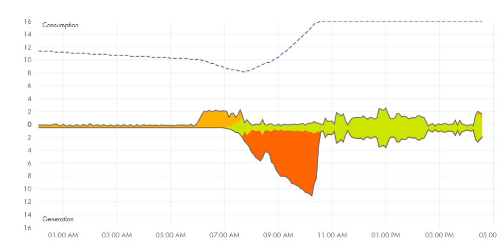 A sunny day in June (when the hot water was set to come on at 10:00) at 9:20 we got to 6.6 kW production before the battery was full.