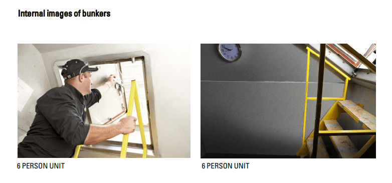 Above ground, this six person bunker relies on hebel blocks and claims to provide the thermal insulation for two hours. There is a below ground option. There are no access issues, and they can be made wheel chair accessible. There is very limited information on the website, with no sizing details, air capacity or ventilation details. It is accredited for use for a maximum of one hour for 6 people – one assumes this is due to air volume in the bunker.