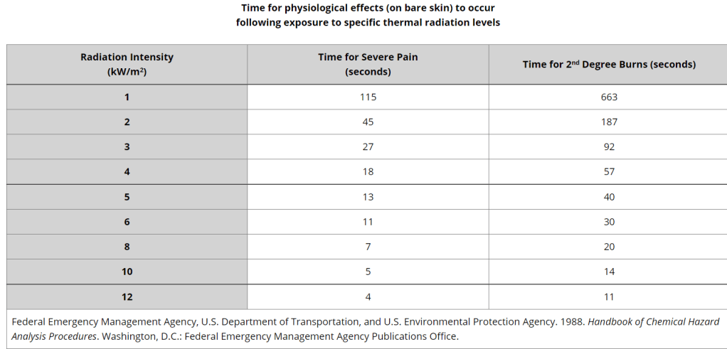 In the offshore oil and gas industry (my working career), we look at risk to personnel as a result of thermal radiation from a fire, since that is one of the primary risks in the business. There’s lots of different numbers and impacts thrown around, because unsurprisingly the results tend to be calculated, and are conservative.