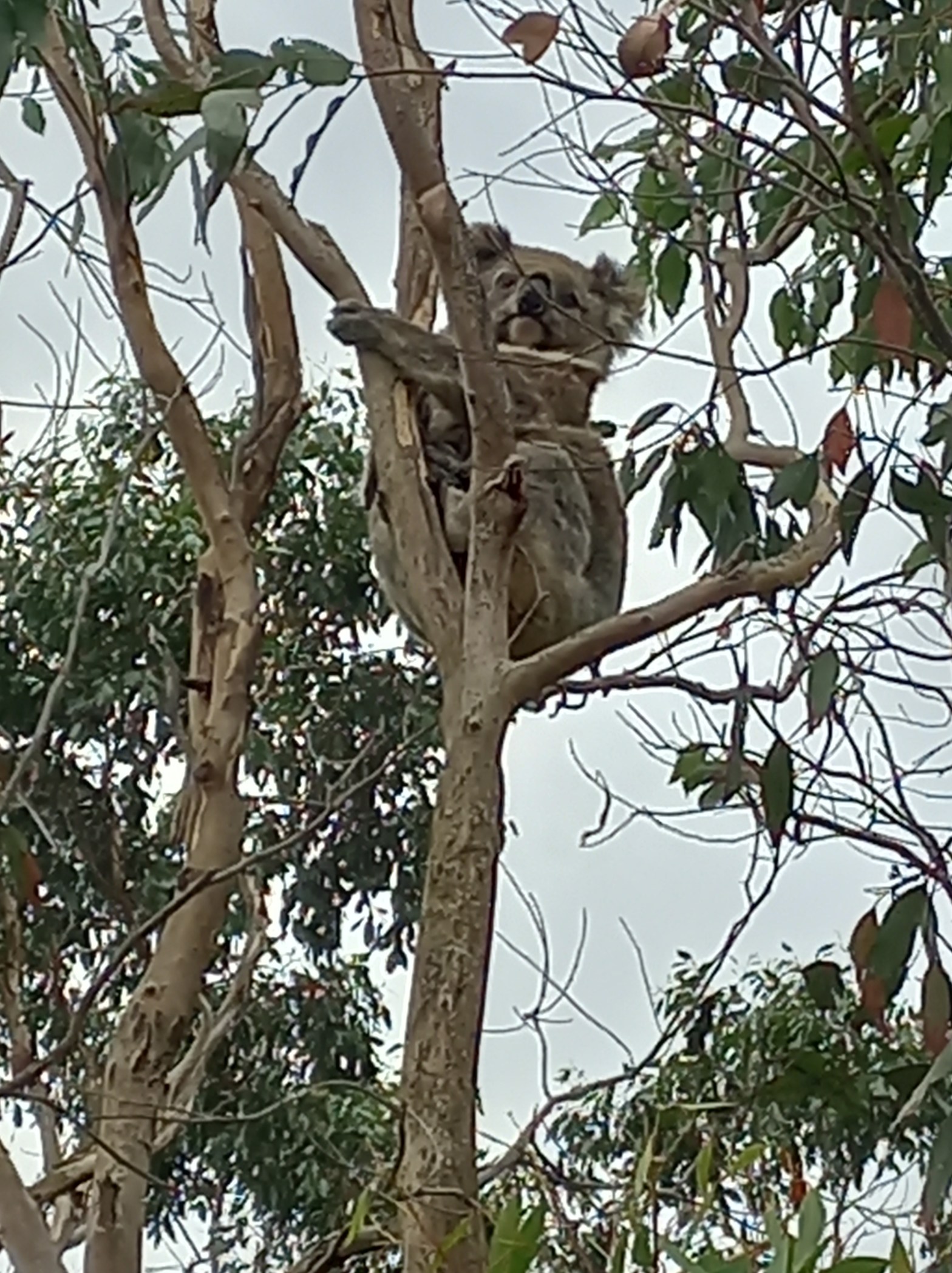 Unusual daytime koala mating activity – the male is chasing the female up the tree with lots of noise. Deep grunting from him, with high pitched screams from her.